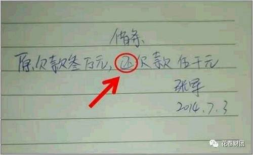 打借条的时候为了省事,很可能就写个数字就轻易了事了。其实这样是想当危险的行为。无论是对于出借人和借款人都是,比如在数字“0”后面加“0”,将“3”,“5”之类的数字改成“8”。稍做修改,借条的金额就会发生翻天覆地的变化。所以大家在写借条的时候,关于数字,年月日相关的都需要用大写来写,防止日后生变。