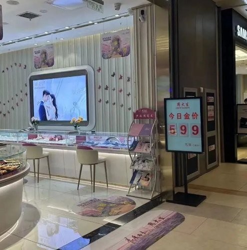 据中国证券报走访,周大生门店销售人员称:“假期每克优惠100元,优惠后599元/克,工本费另算。假期期间,除了门店活动,商场针对购金也有优惠活动。”
