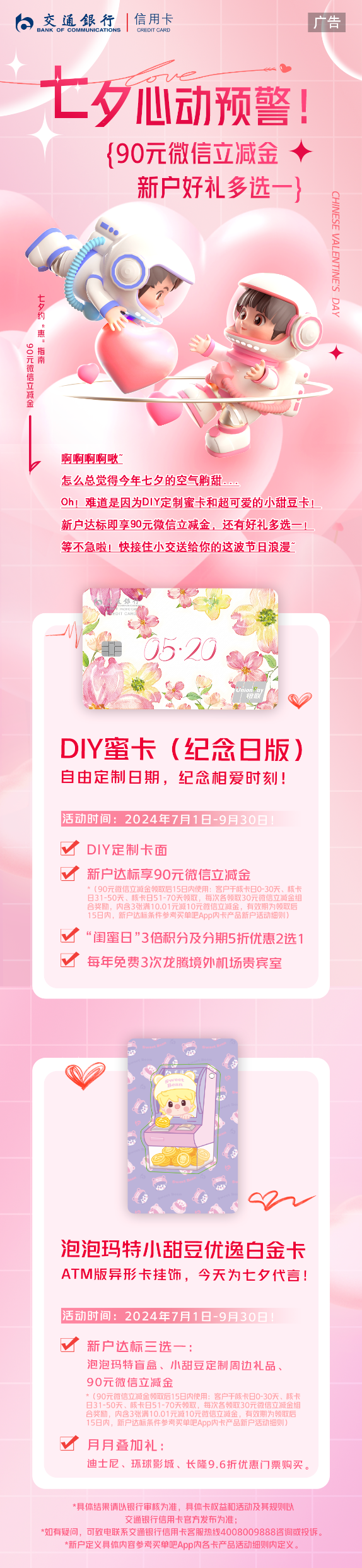 交通银行信用卡|七夕心动预警!90元微信立减金,新户好礼多选一