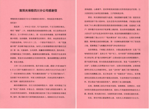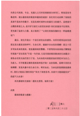 当手机提示音响起,显示重疾赔款到账时,周女士一家激动万分。正如周女士在感谢信中深情写道:“这份理赔金,于病榻上的我而言,分量远超金钱本身。它是‘沉甸甸的信任兑现’,是贵公司‘一切为了客户’文化理念最铿锵有力的证明,是这份强大的精神支撑,让我知道在这场与死神的赛跑中,我不是孤军奋战,阳光保险是我最坚实的后盾。”字里行间,满是对公司的感激与信任。