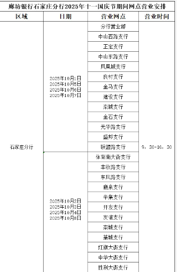 河北理财网:廊坊银行石家庄分行2025年十一假期网点营业安排