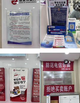 为了充分让客户了解非法金融活动危害性,支行将宣传物料充分摆放至柜台及厅堂各处,在大厅显眼位置的墙上悬挂防范非法集资的宣传标语,在柜台放置防范电信诈骗的宣传折页,让客户充分感受到厅堂防范非法金融活动的宣传氛围。