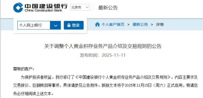 公告显示,为保护投资者权益,该行修订了《中国建设银行个人黄金积存业务产品介绍及交易规则》(以下简称“新版规则”),内容主要涉及交易报价、巨额赎回等事项,新版文本将于11月15日正式启用。