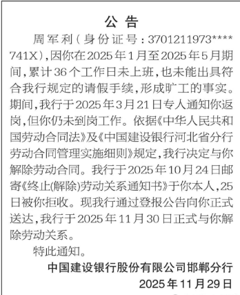 河北理财网综合(丹青)河北理财网获悉,建行邯郸分行1129日通过《河北经济日报》刊发公告:员工周某利20251月至5月期间,累计旷工36个工作日,全程没办任何合规请假手续。银行3月专人通知返岗,无人回应;10月邮寄解约通知被拒收;最后1129日登报公示,1130日正式解除劳动关系。