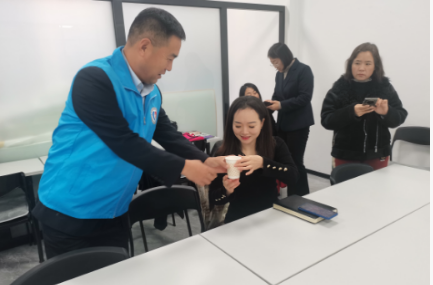 活动前期,中支组建“暖心服务小队”,结合业务节奏与员工需求,精心筹备了红茶、枸杞、红枣等暖心茶饮及煮茶用具。针对外勤团队外出展业、内勤团队集中办公的不同场景,服务小队采取“定点值守+上门配送”相结合的方式,在营业区会议室、收展团队活动室、客户服务中心设立“暖心茶站”,同时深入业务一线、展业现场,为忙碌中的员工递上热气腾腾的茶饮,详细询问他们的工作进展与实际需求,倾听业务开展过程中遇到的难点问题,并现场协调行政、合规等部门提供支持。