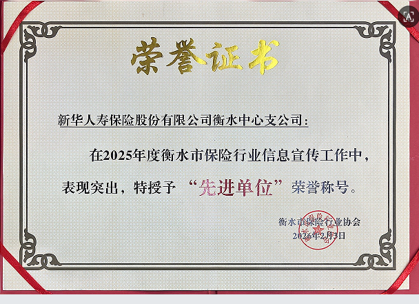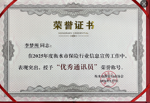 衡水市保险行业协会公布2025年度信息宣传工作表彰名单,新华保险衡水中支凭借扎实的宣传基础、创新的传播形式和持续的稿件输出,荣获“2025年衡水市保险行业信息宣传工作先进单位”称号;新华保险衡水中支综合管理部行政管理岗员工李梦所同志因全年报送稿件数量多、质量高、时效性强,深度参与行业舆情引导与品牌建设,被授予“2025年衡水市保险行业信息宣传工作优秀通讯员”荣誉称号。