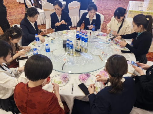 女职工们在专业老师的细致讲解与耐心指导下,纷纷化身心灵手巧的“艺术家”。大家手持素白雅致的团扇,认真挑选永生花,从构思造型、搭配层次,到精心修剪、小心粘贴,每一个步骤都专注投入。一朵朵鲜花在大家的巧思与巧手中错落有致、相映成趣,与团扇完美相融。活动现场气氛轻松愉悦,在交流协作中增进了情谊,也提升了文化素养和审美情趣。